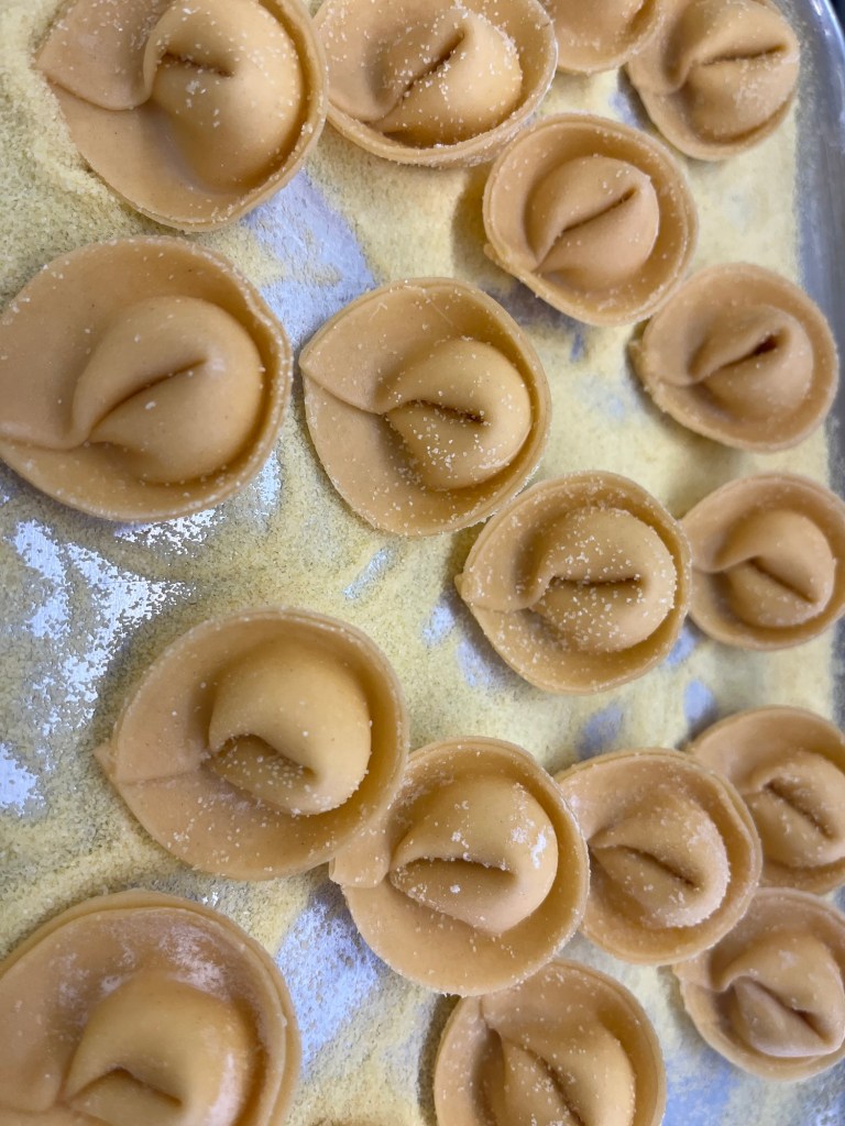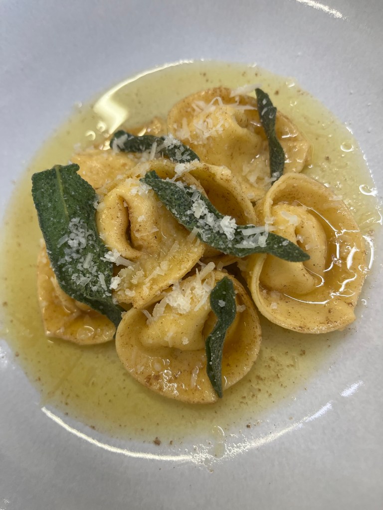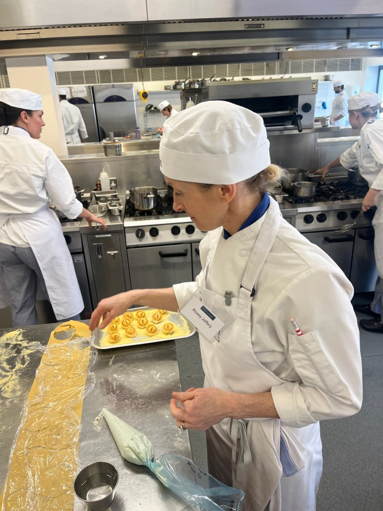 Tuesday began with a meditative kitchen session making tortellini. We were told that the shape famously resembles the navel of Venus. An infatuated innkeeper apparently created it after spying on her in her room. Having made a golden dough, enriched with egg yolks; and a filling of ricotta, parmesan, lemon and nutmeg, we began the careful creation of the belly button pasta. Piping the filling into the centre of a pasta circle, folding it over, crimping to remove any air; creating a divot in the soft filling and then bringing together the two edges to sit atop each other and sealing with water. Stunning! Alongside the tortellini we also assembled and cooked a Madeira jus ahead of our venison assessment on Friday.
