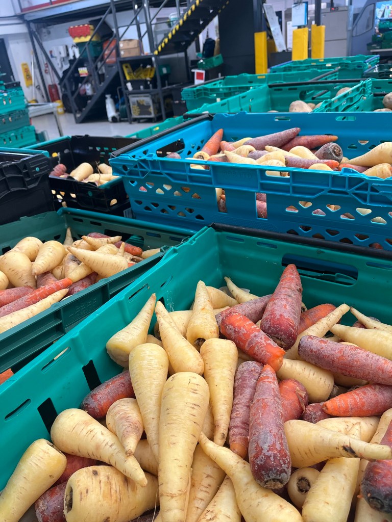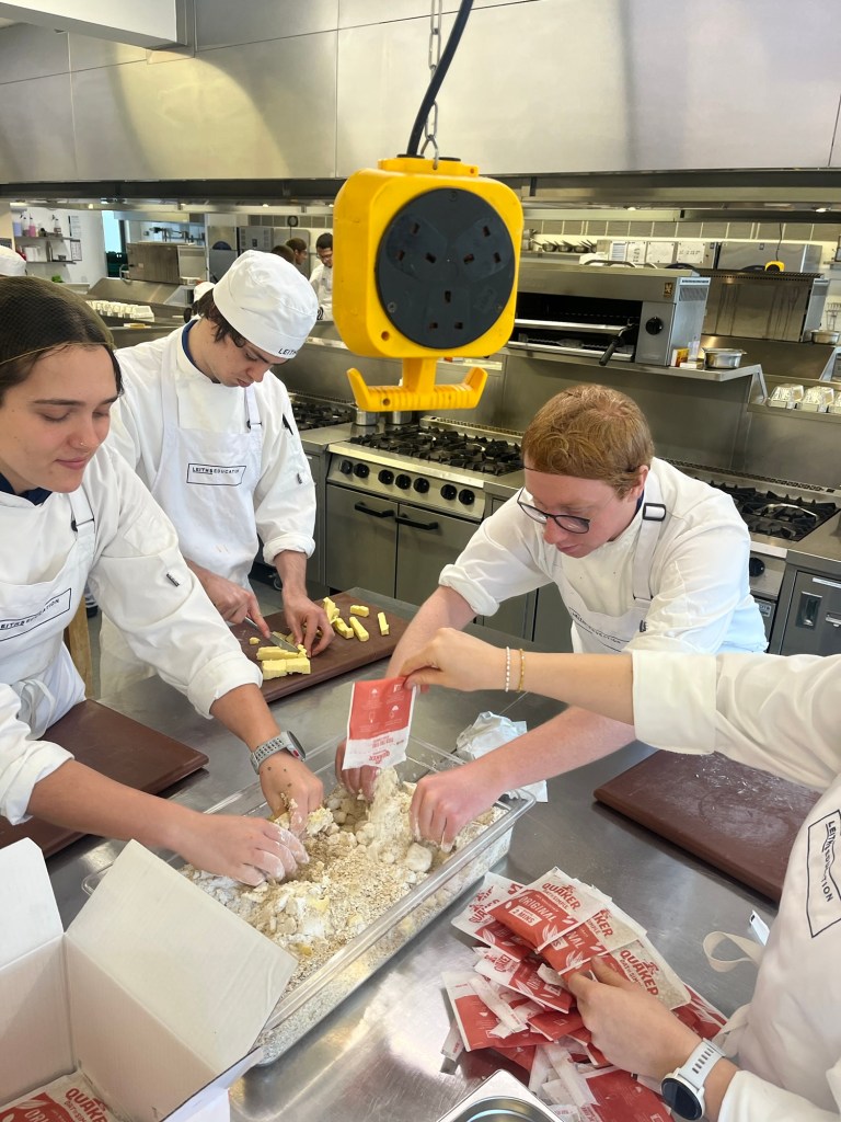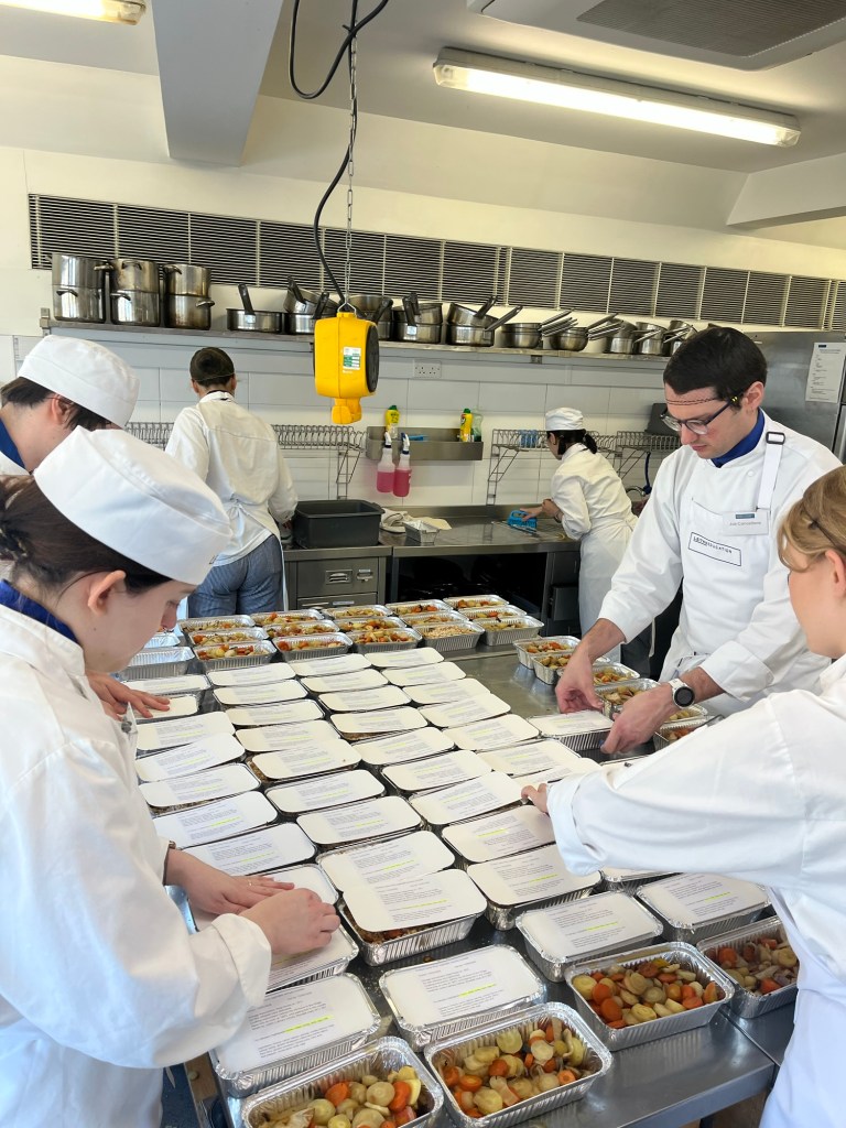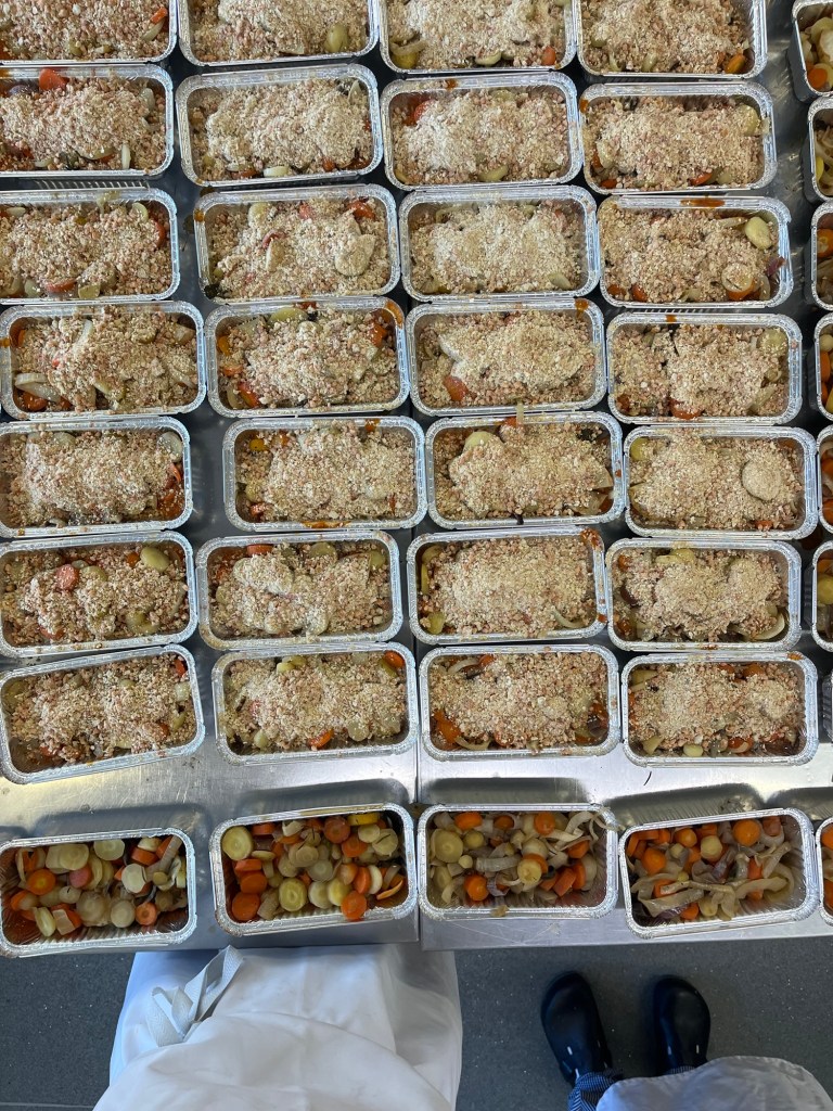 In the afternoon, a small group of us went to the City Harvest depot to kick off our charity cook project. The depot is huge and houses an enormous amount of food (fresh and store cupboard) that would otherwise go to waste. The charity rescues surplus food from farms, manufacturers, wholesalers and retailers and then delivers it to organisations who feed those facing food poverty. Our task was to each lead a small group of fellow students to produce 50 portions of food using the ingredients available in the depot that afternoon. There were vast quantities of root veg, onions and porridge oats, together with cauliflowers and cabbages as big as your head. Our collective creative juices began to flow. The root veg and oats combo gave me the idea of a savoury crumble. I then stumbled upon a pallet of ‘smoky flavoured sprinkles’ which became the genius flavour bomb addition to the crumble topping. I also grabbed a stack of tinned tomatoes and a dozen red pepper and ricotta pesto jars. We loaded up the palettes of our selected goodies and headed back to school to await the delivery. In the meantime, we prepared a high level plan for the following day’s cook to ensure we had priorities and a sequence to lead our team members.