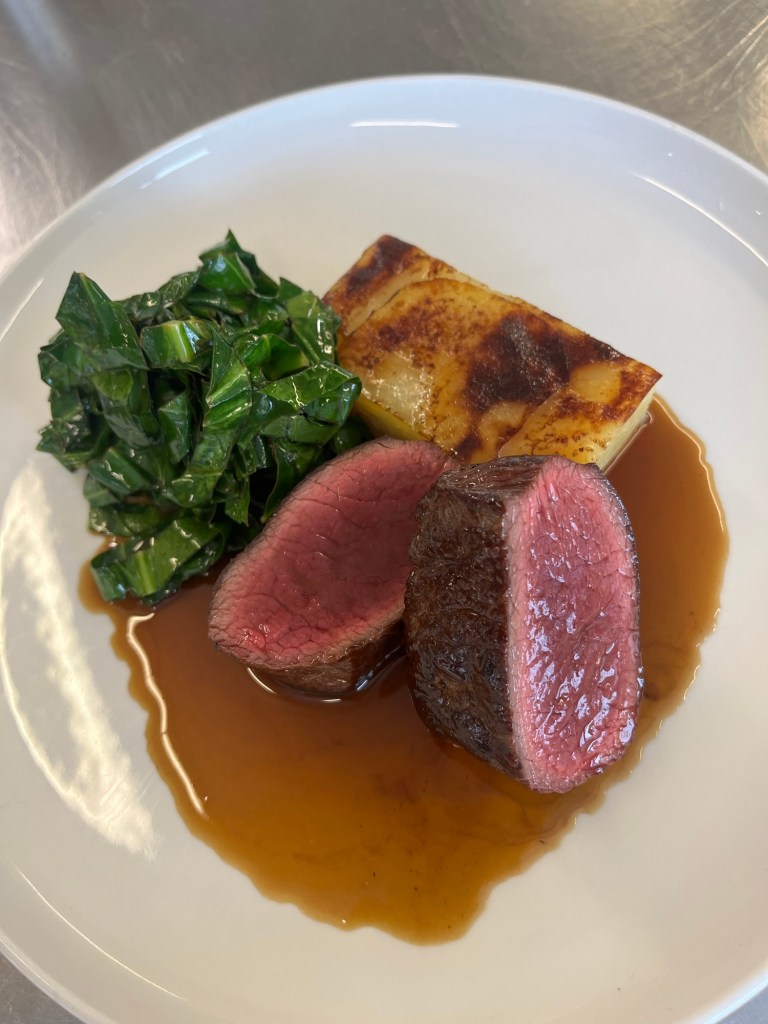 Nerves were in abundance on Friday morning. Our fourth and final ‘continuous’ practical assessment. A venison steak cooked rare, pommes Anna, spring greens cooked to chef’s choice and a Madeira jus with plenty of flavour, shine and clarity required. I started with the pommes Anna – melting the clarified butter and tackling the death trap that is the mandolin to slice the potatoes. Lots of seasoning and nutmeg and then layering the coated slices neatly in a small frying pan. The melted butter sets up really quickly so it had solidified before I’d even got going. I smeared it round the edge of the pan in an effort to ensure a clean exit from the pan later. The Madeira jus tasted ok but needed reducing to intensify the flavour plus some butter, lemon juice, salt and double cream to achieve a balanced finish. First time cooking venison and it seemed straightforward: temper, sear on all sides for a few minutes, baste in butter and thyme, and rest for at least 8 minutes. Venison is the only meat we have cooked to rare rather than medium rare so lengthy tempering and resting were even more important than ever. The pommes Anna nearly skidded off the plate as I inverted the pan. Thankfully no real crisis and more importantly the top was beautifully golden with caramelisation.