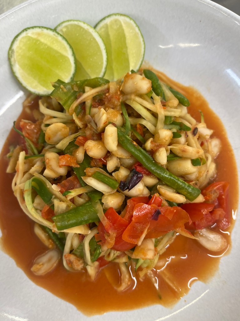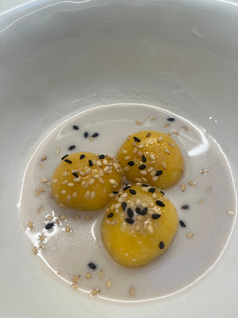 But what about the food, I hear you ask! For week one there were a range of delicious recipes and cuisines starting with Thai. Day one was an all day group cooking exercise recreating dishes shown to us by Andy Oliver from Som Saa at the end of last term. A simple soup of greens and shiitake with an egg dropped in just as the soup boils to create strings of cooked egg amongst the clear broth. Incredibly comforting – this is what you need at the end of a tough day. Next, a green papaya salad Bangkok style. This was prepared in a Thai pestle and mortar – high-sided and deep with a rolling pin sized pestle with which to muddle and bruise. For main course, Som Saa’s famous crispy fish green curry with Thai aubergines and wild ginger. Served with jasmine rice, it was the perfect balance of salty, sweet, spicy and tangy. We made the base of the curry from our own coconut cream which required some muscle work to crack into coconuts and separate the flesh from the hairy shell. To finish, we created delicious baby dumplings from a squash purée dough, poached in water with a pandan leaf and then warmed through and served with more of the coconut cream flavoured with sea salt and sugar. Each dumpling encase a surprise nugget of palm sugar which oozed into the cream on eating.