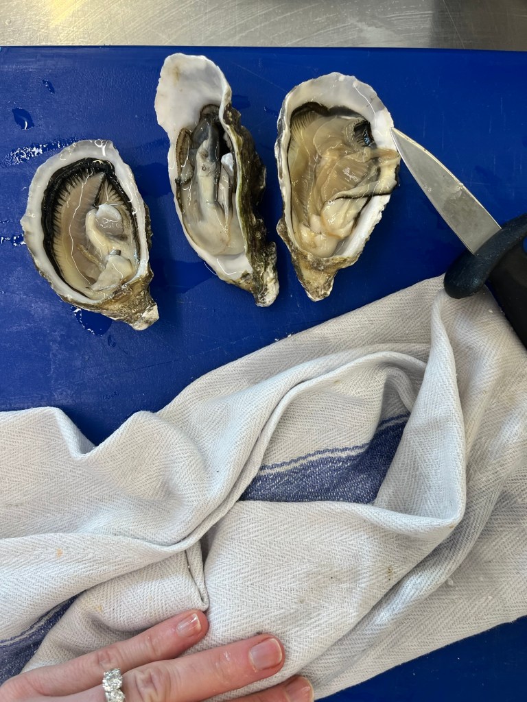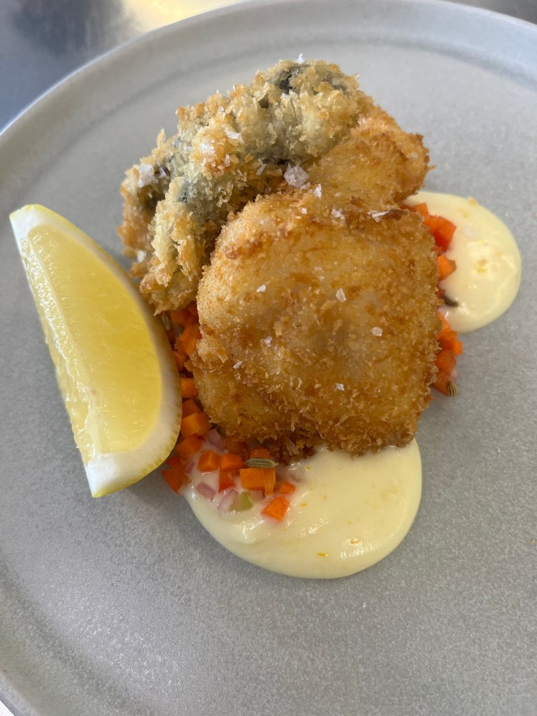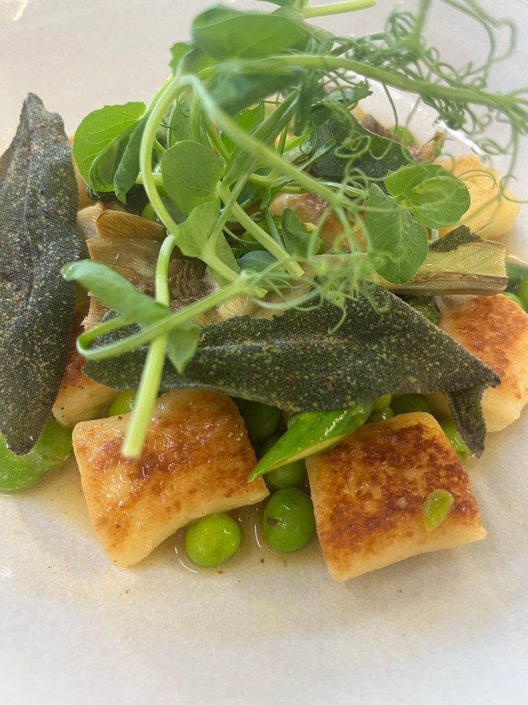 On day two we got to grips with oyster shucking. An instructive in-kitchen dem and we were away serving them on a deep bed of sea salt and a twist of lemon. But, of course, this wasn’t all we had to do. We also prepared cod cheeks, pane’d and deep-fried them. They were served alongside a citrus mayonnaise (made by machine, not hand, woohoo!) and a sharp and crunchy pickled veg salad with fennel and chilli. It made for a holiday-worthy lunch in the spring sunshine. In the afternoon, we had a ‘vegetable-led’ dem. Grace cooked us pillowy soft and light potato gnocchi with braised artichokes, asparagus and freshly podded peas and broad beans: spring on a plate. The following day we recreated it ourselves including braising the artichokes. Quite a bit of effort is required to get to the tasty heart of the flower and ensure they don’t lose their vibrant colour (acidulated water is a must).